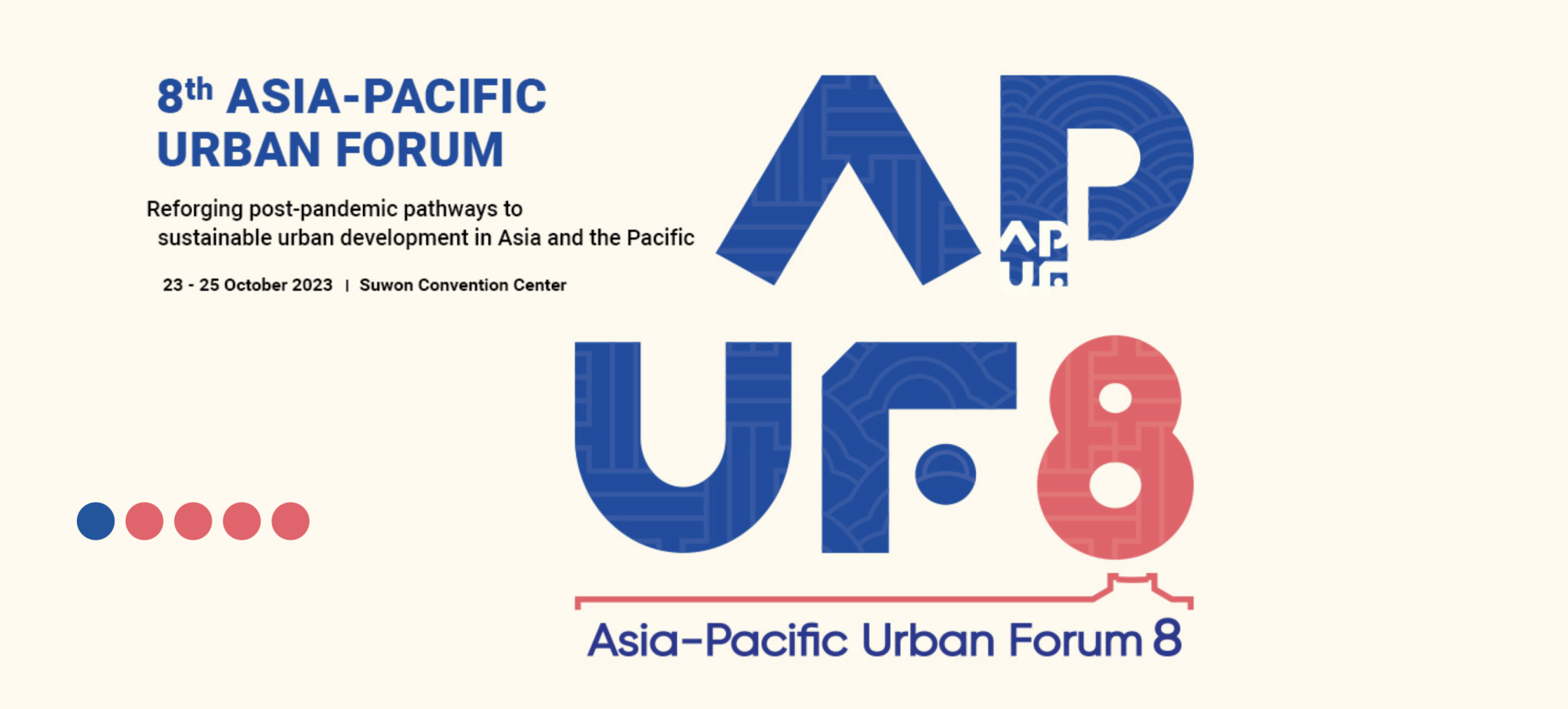 For the past three decades, the Asia-Pacific Urban Forum has played a pivotal role in convening the region's premier multi-stakeholder forum on sustainable urban development. The 8th Asia-Pacific Urban Forum (APUF-8) will be held from 23 to 25 October 2023 in Suwon City, Republic of Korea. The Forum brings together the experiences of diverse stakeholders to reflect on the colliding crises faced by cities in Asia and the Pacific, synthesize innovative approaches and actions to support sustainable urban development in the context of the New Urban Agenda and the decade for action for the Sustainable Development Goals (SDGs). Sessions will draw unique insights from urban thought leaders, government officials and major stakeholder groups, based on real-world experiences of resilience-building and transformation through and beyond the pandemic.