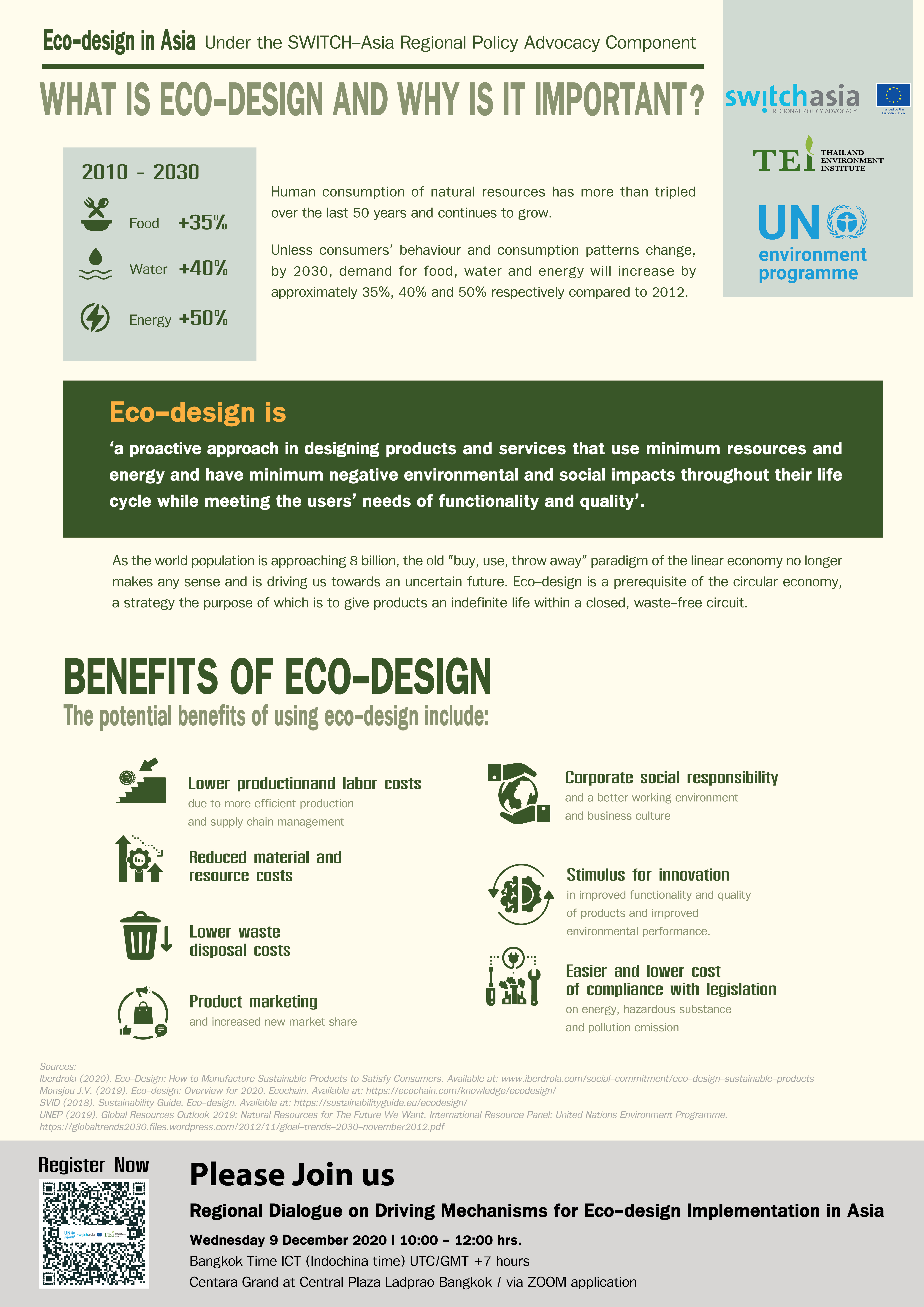 Human consumption of natural resources has more than tripled over the last 50 years and continues to grow. Eco-design is a proactive approach in designing products and services that use minimum resources and energy and have minimum negative environmental and social impacts througout their life cycle while meeting the users' needs of functionality and quality.