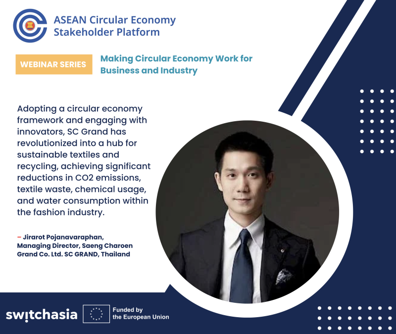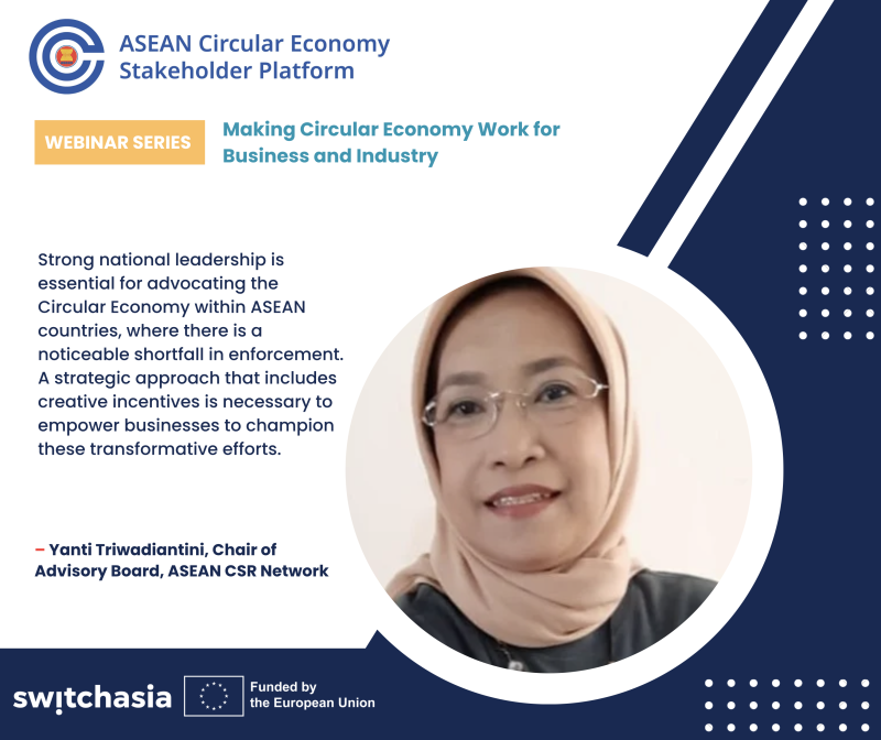 The webinar series, hosted by the ASEAN Circular Economy Stakeholder Platform and co-hosted by the EU SWITCH-Asia Policy Support Component, is strategically designed to foster the adoption of Sustainable Consumption and Production (SCP) practices in the context of the Circular Economy (CE) across the ASEAN region. Recognizing the need for a comprehensive approach addressing both supply and demand aspects and bringing together diverse stakeholders, these webinars intend to raise awareness, promote understanding, and facilitate an inclusive dialogue on making the circular economy a tangible reality in the ASEAN region. Thereby, the series aims to strengthen networks and knowledge exchanges among institutions working towards shared sustainability goals.