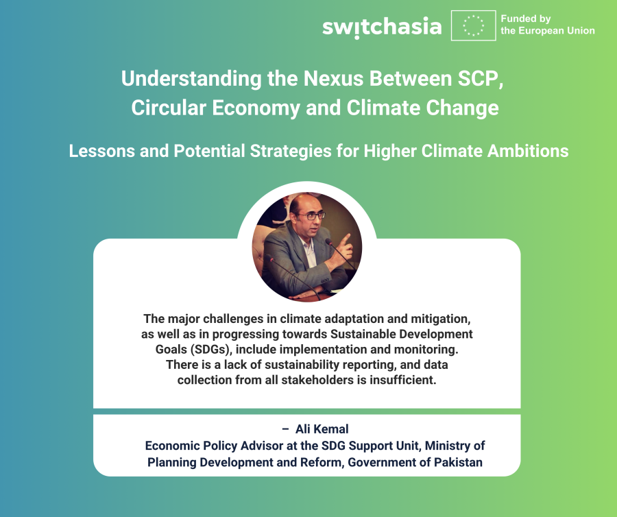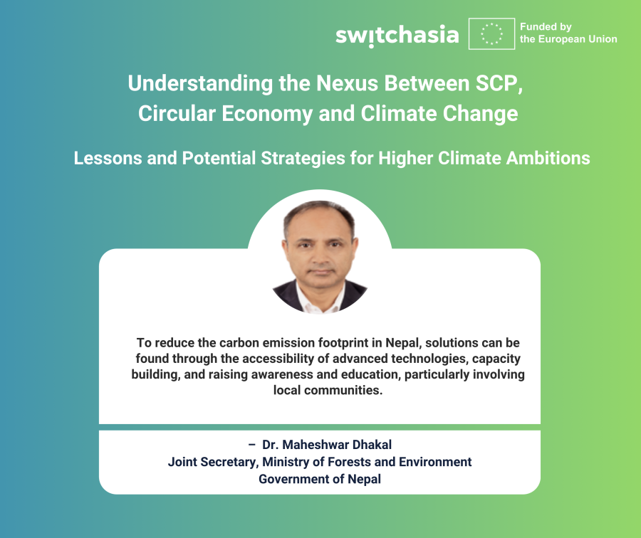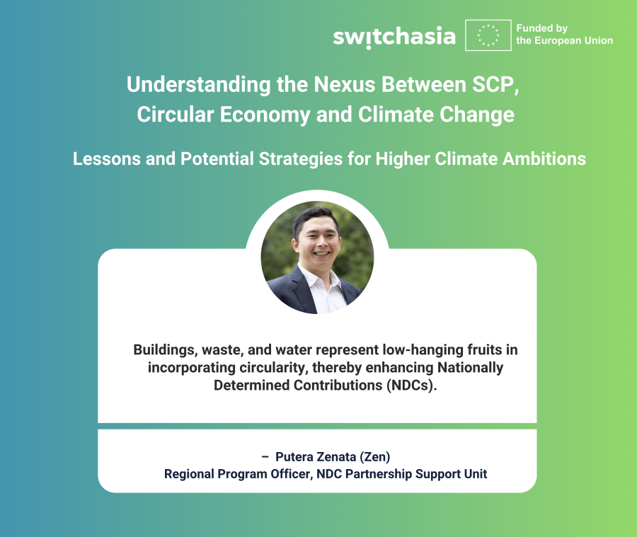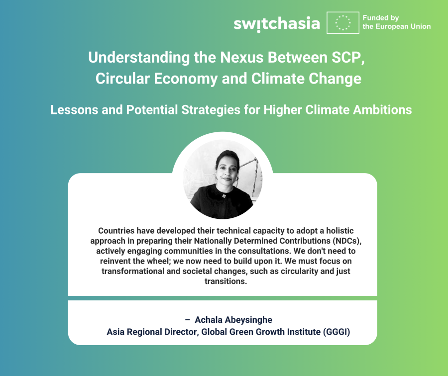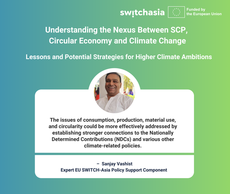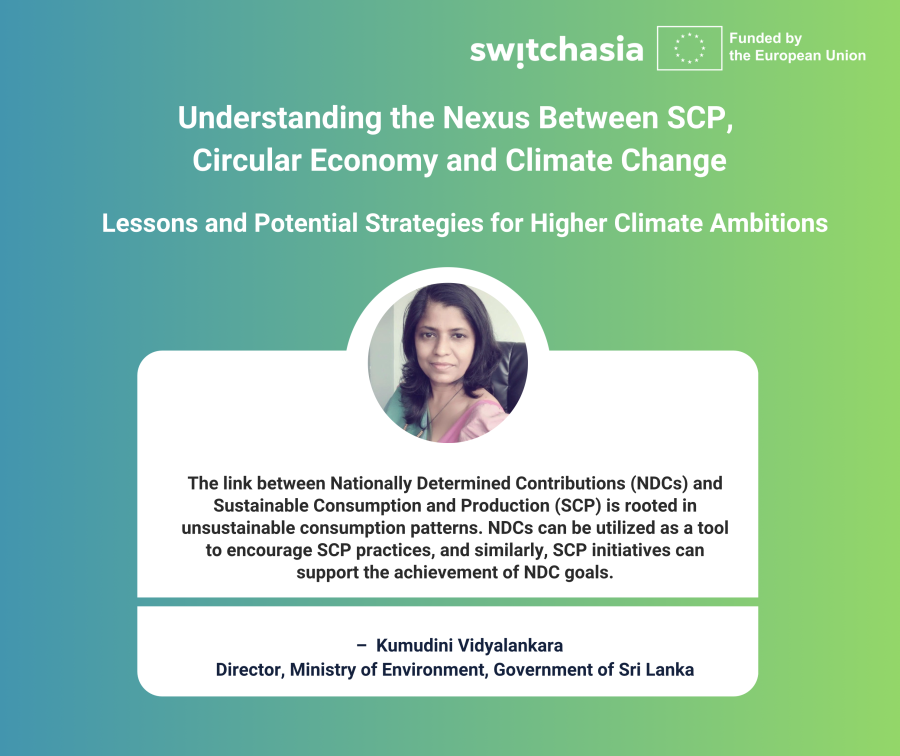 This is the second webinar of a series exploring the nexus between NDC and SCP/CE. The first webinar explored global insights and experiences at the intersection of climate change and SCP/CE. It aimed to facilitate knowledge exchange and lessons learned in this critical area. The second webinar will build on the first webinar, the global policy discussions that took place around the GST, and the ongoing Technical advisory of the SWITCH-Asia programme in 5 South Asian Countries on SCP-linked NDCs.