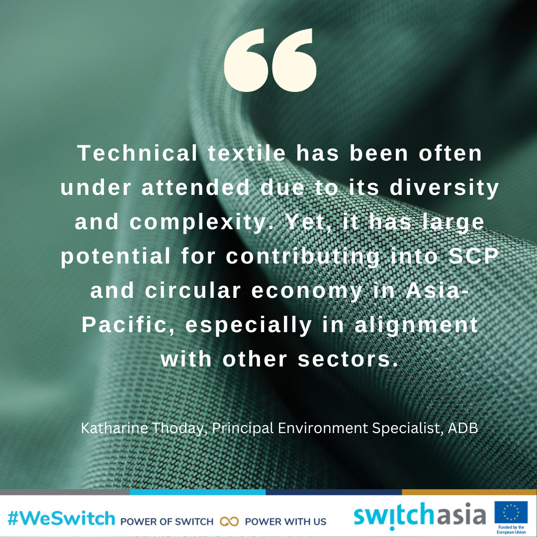 Technical textiles play an important role in our daily lives; they can be found in our homes, hospitals, sportswear, vehicles, buildings, and farms, among other places. A combination of technology and modern materials made technical textiles a viable option for a wide range of applications. However, the industry also has a negative social and environmental impact. The textile industry contributes roughly one-fifth of global industrial water pollution, employs a wide range of hazardous chemicals, and emits significant greenhouse gas emissions, particularly during the manufacturing and finishing stages. While the effects on the fashion industry are well documented, much less attention has been paid to technical textiles, which have seen rapid growth in recent years. This proposed webinar, co-hosted by the Asian Development Bank (ADB) and the EU SWITCH-Asia SCP Facility, will discuss current trends, drivers, challenges, and game changers for moving the technical textiles industry toward a circular and sustainable value chain, with a particular emphasis on identifying leverages and trigger points for sector-wide transformative change.