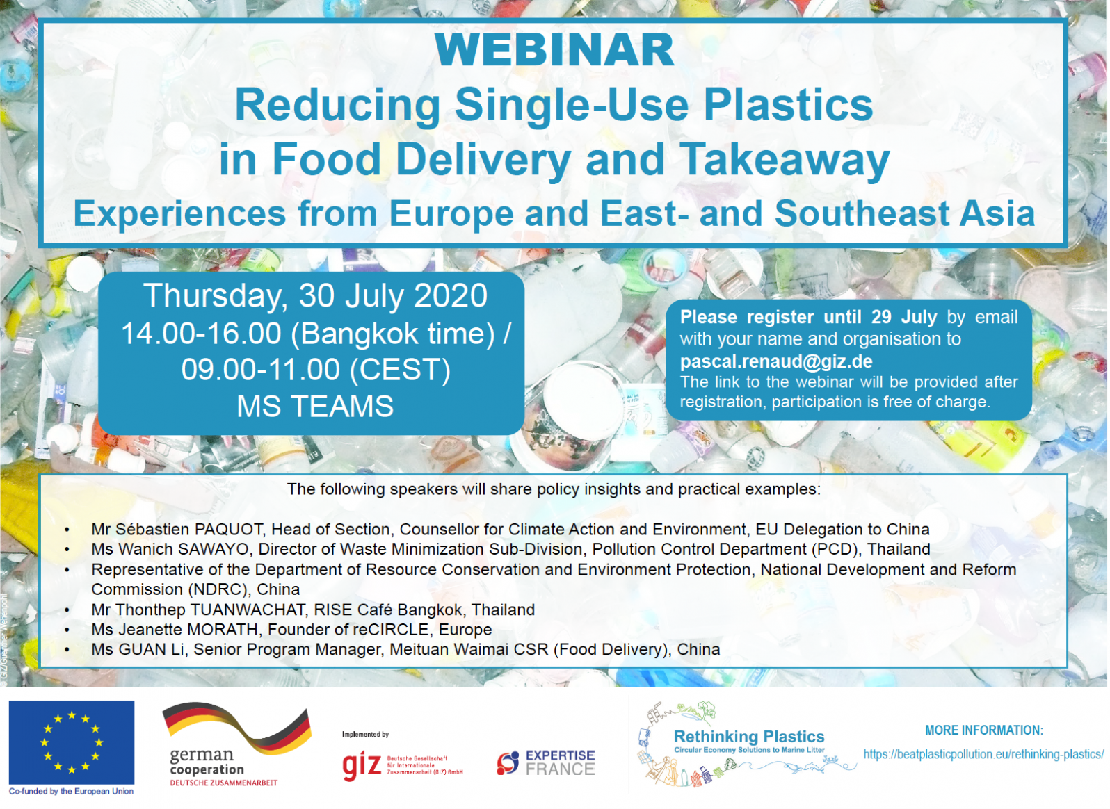 The webinar is organised by the project “Rethinking Plastics – Circular Economy Solutions to Marine Litter”, which is funded by the European Union (EU) and the German Federal Ministry for Economic Cooperation and Development (BMZ) and implemented by GIZ and Expertise France. The webinar will be held in English on the platform MS Teams.