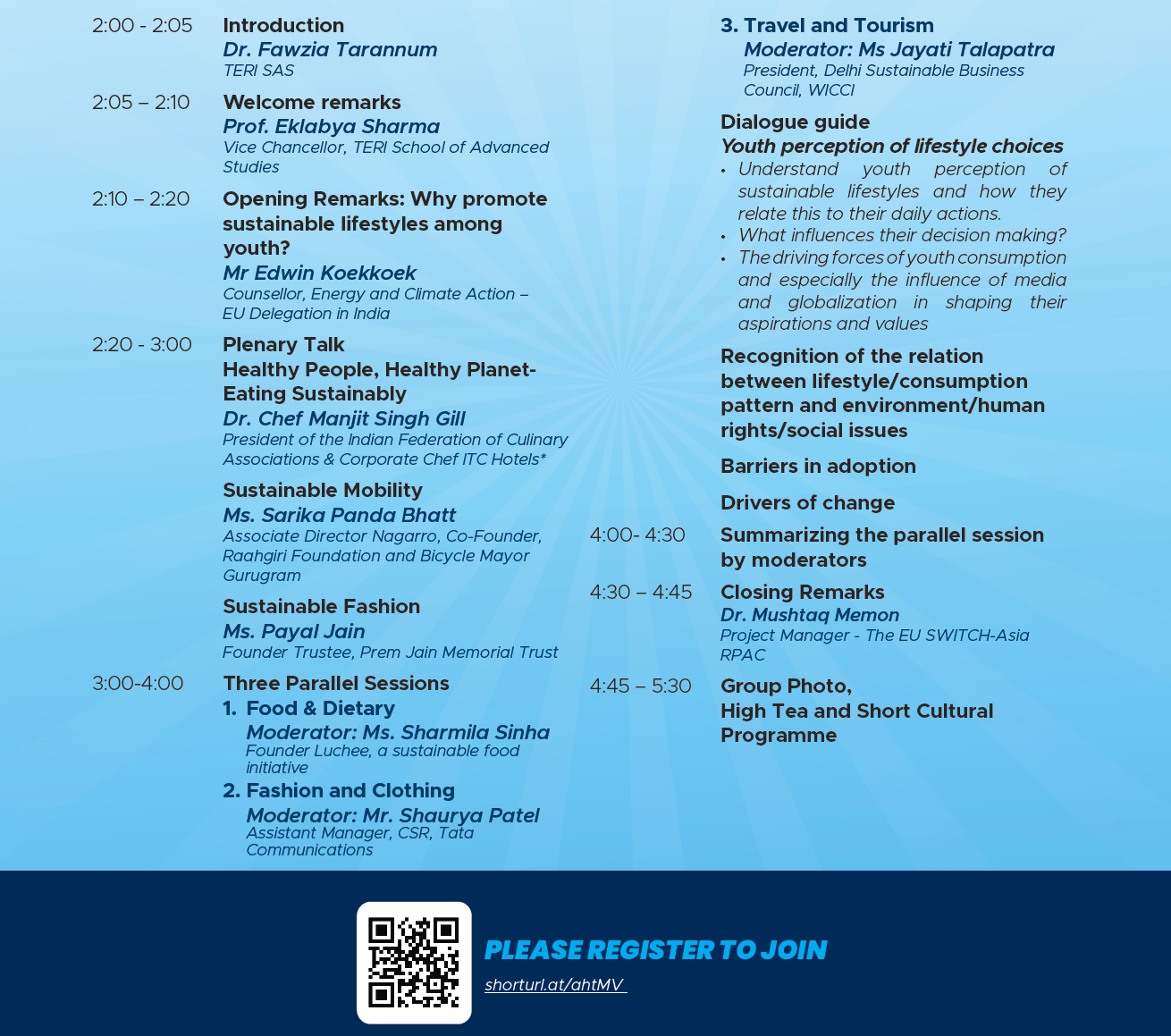 India has the world’s largest youth population, and they have the potential to transform the production and consumption of goods and services by making conscious and informed choices in their daily lifestyles, shifting to more sustainable buying patterns, limiting waste, and leading technological innovation to foster a resource-efficient economy and equitable society. In this context a Youth Dialogue on Sustainable Lifestyles is scheduled on November 10th as an on-site event with Live Streaming. The event aims at enhancing awareness and alteration of actions among the largest demography in India on sustainable consumption and lifestyles, understanding barriers in adoption and identifying drivers of change.