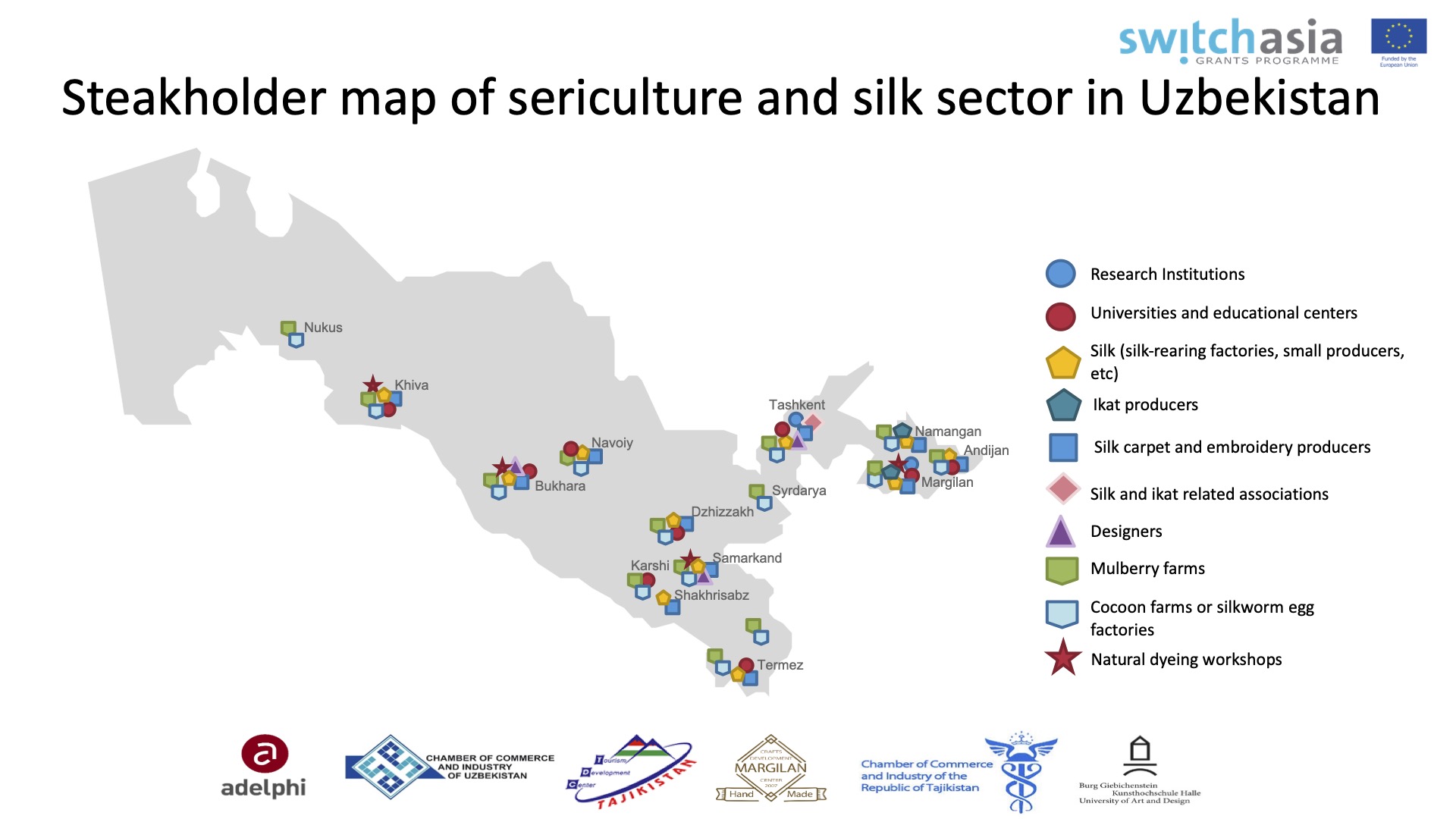 В феврале 2021 года в рамках проекта «RUTSIS»*, финансируемого Евросоюзом, эксперты ТПП сформировали карту участников рынка шелководства и атласа, в которую входят предприятия, дизайнеры, университеты, мастерские "устод- шогирд" и научно-исследовательские центры данной сферы.