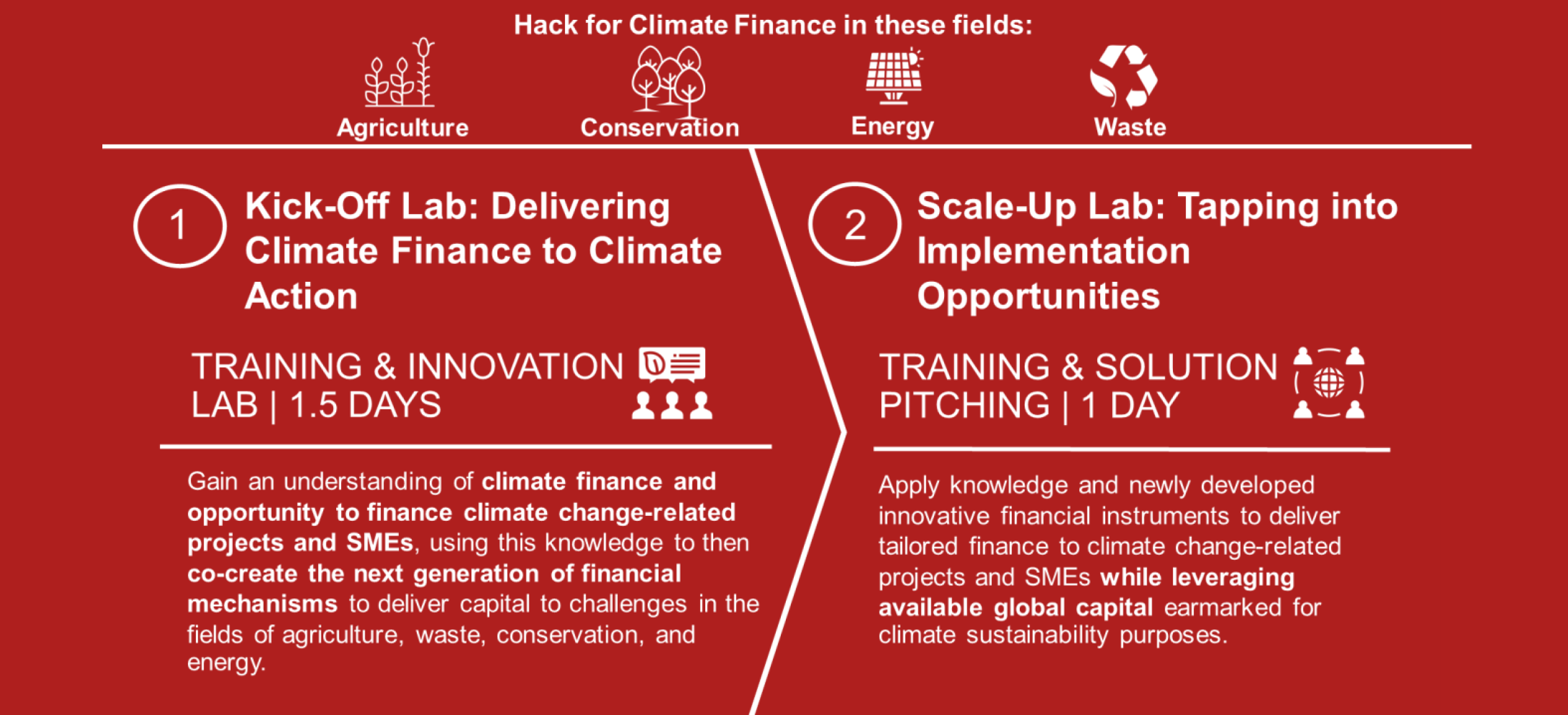 Through a rapid, tailored and hands-on support and advisory process climate finance solution developers will gain a thorough understanding and develop a financing solution (hack) to deliver tailored financing to climate change-related projects and SMEs while tapping into growing international capital earmarked for climate change purposes. The solutions shall tackle multiple Sustainable Development Goals (SDGs) and will foremost combat climate change (SDG13) while advancing sustainable consumption and production patterns (SDG12).