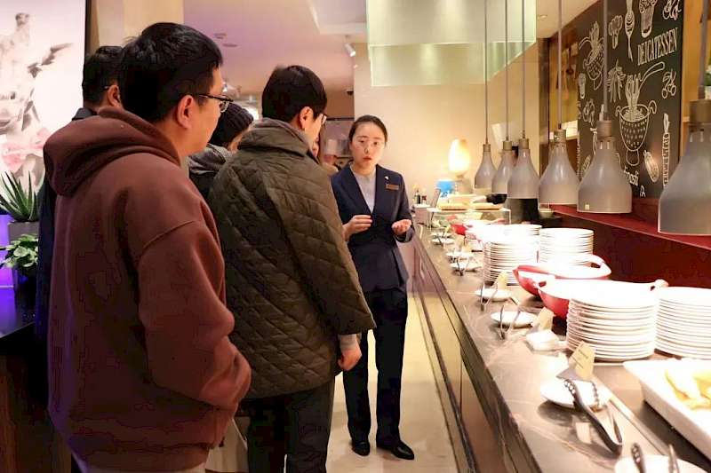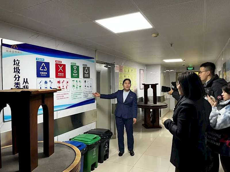 The first stop for the guests was Kuntai Jiahua Hotel. The hotel restaurant reduced food waste by serving smaller portions in separate dishes, using smaller bowls, labeling non-halal food, and displaying customer reminder signs. The pilot program resulted in a 30% decrease in daily customer leftovers. Measures were also implemented in the kitchen, including reusing watermelon and fruit peels, and improving the accuracy of customer estimates. During the pilot period, kitchen preparation losses decreased by 24%. The hotel staff shared their experience of keeping daily records of kitchen waste and carrying out activities aimed at reducing waste by employees.