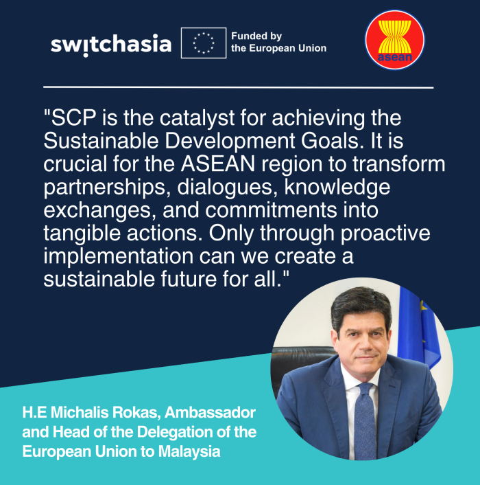 H.E Michalis Rokas, Ambassador and Head of the Delegation of the European Union to Malaysia, expressed his enthusiasm for the launch event, emphasising the EU's commitment to working with ASEAN member states as strategic partners in achieving common goals. He highlighted the importance of SCP and circular economy concepts in achieving the Sustainable Development Goals (SDGs) and reiterated the EU's support for the implementation of the ASEAN SCP Framework.