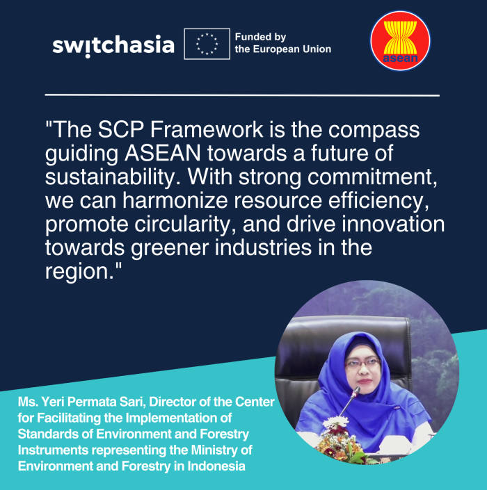 Ms. Yeri Permata Sari, Director of the Center for Facilitating the Implementation of Standards of Environment and Forestry Instruments representing the Ministry of Environment and Forestry in Indonesia also highlighted the importance of the ASEAN SCP Framework to facilitate the transition of ASEAN countries towards a low-carbon, resource-efficient, and circular economy.