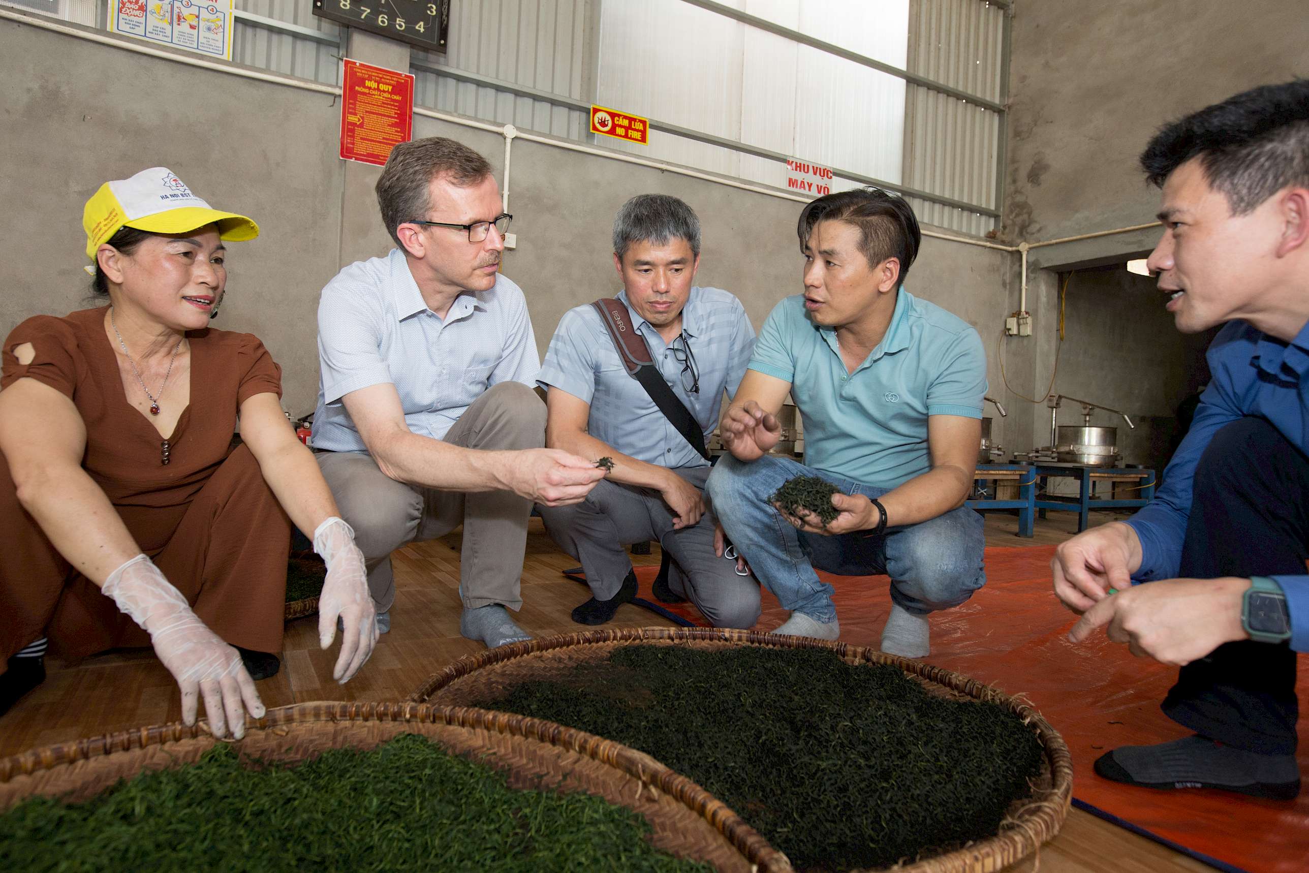 Mr. Quy (second from the right) discussed with the EU delegation the quality of the new batch of tea
