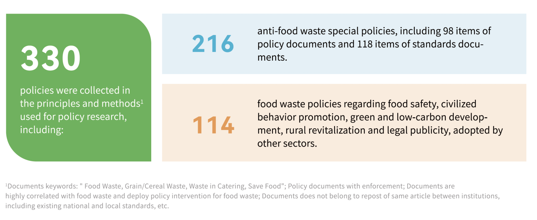 As of November 2023, the team that has worked on the compilation of the Report has collected a total of 330 relevant policies, including 216 anti-food waste special policies, and 114 related policies in other fields incorporating food waste reduction.
