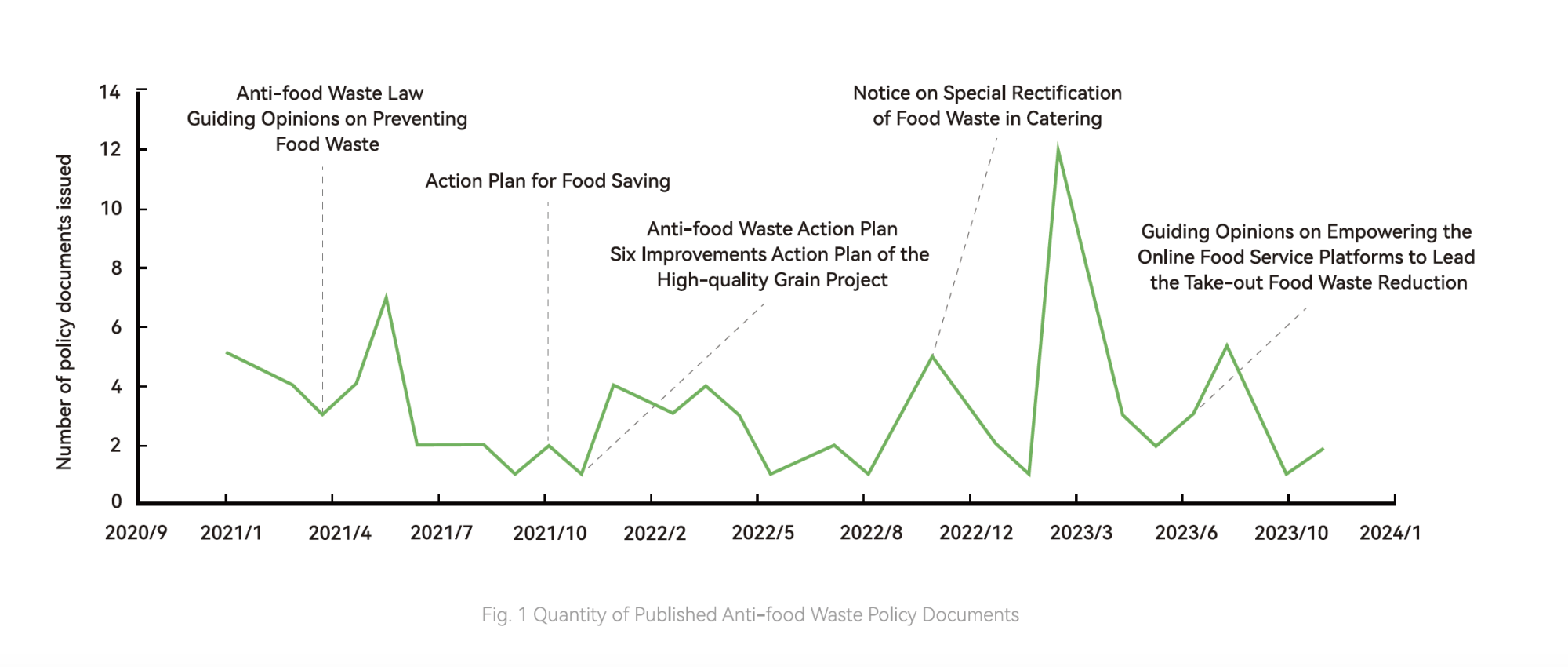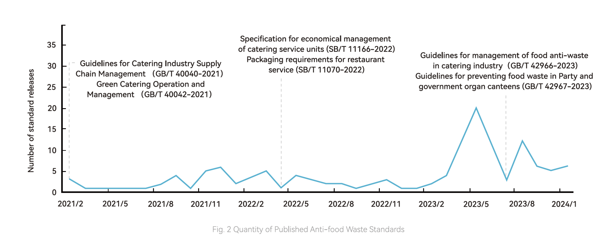 In April 2021, China legislated its first anti-food waste law, the Anti-food Waste Law of the People's Republic of China , and subsequently introduced the Action Plan for Food Saving and the Anti-Food Waste Work Plan in the same year. In 2023, three recommendatory national standards were released, including the Specification for Quality Management of Catering Enterprise, the General Rules for Management of Anti-food Waste in Catering, and the Guidelines for Preventing Food Waste in Party and Government Organs.