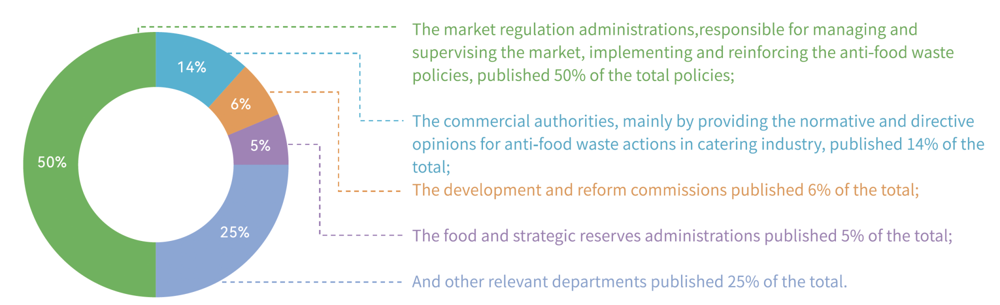 Moreover, the responsible authority bodies for the policies are diverse, including government departments, industry associations and civil societies, the national or local market regulation administrations, commercial authorities, development and reform commissions, food and strategic reserves administrations, general offices of local governments, among others. The formulation and implementation of these regulations, policies, and standards provide strong guarantees for preventing and curbing food waste behavior.