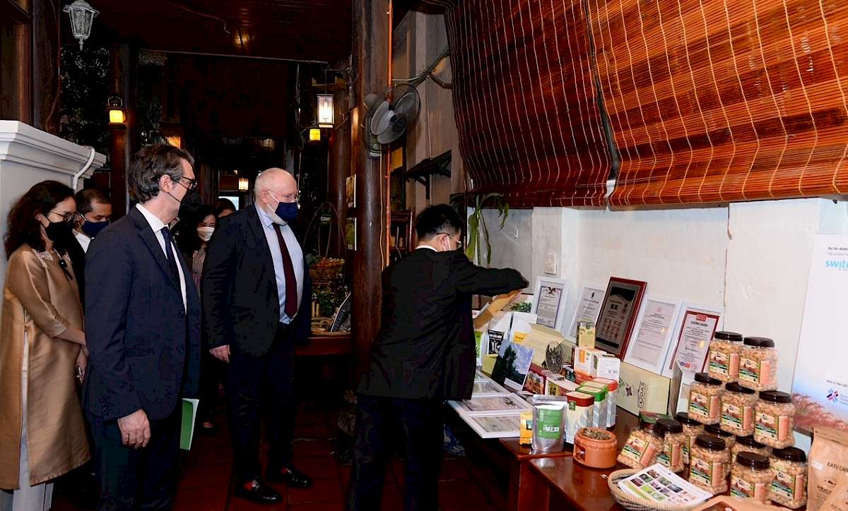 On February 18, 2021, at the Tra Ta space in Hanoi, Vietnam, the European Union funded SWITCH-Asia project "Promotion of supply and demand of eco-fair agri-food processing products in Viet Nam" (Eco-Fair project) had the honor to welcome Mr. Frans Timmermans, Permanent Vice President of the European Commission, Mr. Giorgio Aliberti, Ambassador of the Delegation of the European Union to Viet Nam and other European Union delegates at an exhibition of several EU funded projects implemented in the country.