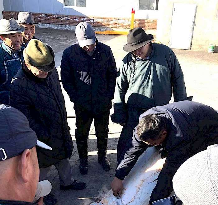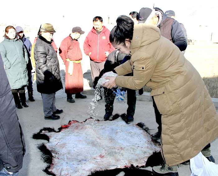 The training addressed the determination of quality (in terms of sorts/types of material and grading) of existing supplies of hides and the scope for improvements, using objective and subjective methods. It also demonstrated improvements (to pre-slaughter and peri-slaughter operations) to be adopted by producers supplying raw materials to the tanneries in the future; including (for example) improved fleshing. The adoption of these improvements will help reduce the environmental impact of the Mongolian vegetable tanned yak leather Cluster by decreasing the amount of waste generated (less spoiled hides, utilisation of waste for by-product production). Buyers (and/or agents), beamhouse supervisors and quality assurance technicians were advised on how to maintain information on the quantity and quality of raw materials. Improved processes were also introduced in tanneries to increase compliance with quality assurance requirements. The contents of this training were also linked to (and consistent with) the previous training delivered to herders, veterinary extension officers, traders and merchants of yak hides, and staff of slaughter facilities.