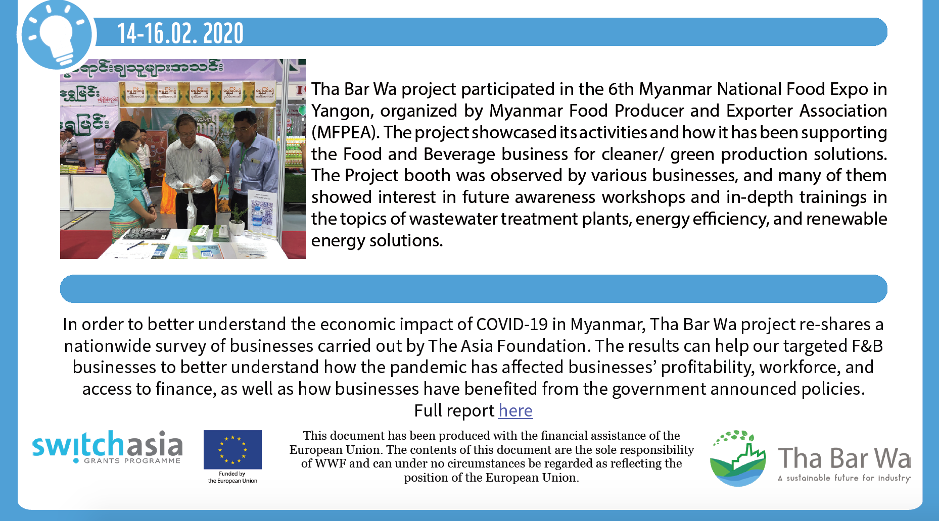 Tha Bar Wa project is funded by the European Union under the SWITCH-Asia Programme. It promotes cleaner production within the food and beverage industry by promoting wastewater treatment plants, energy efficiency, and renewable energy. It supports financial institutions to offer banking products designed specifically for cleaner production.