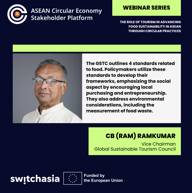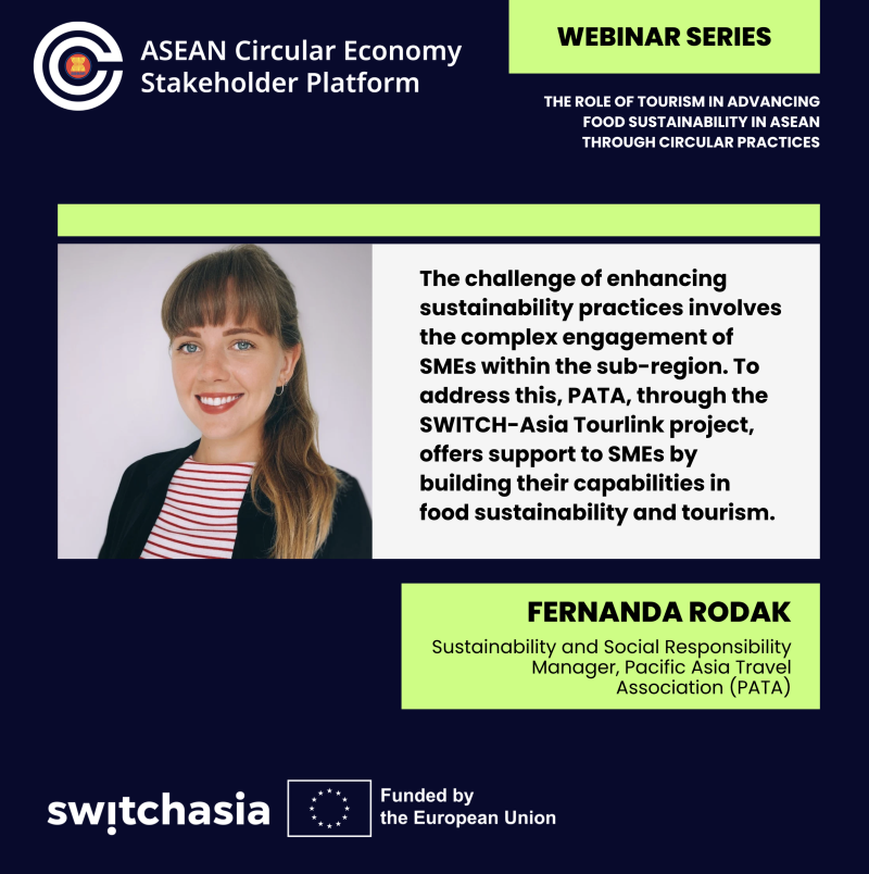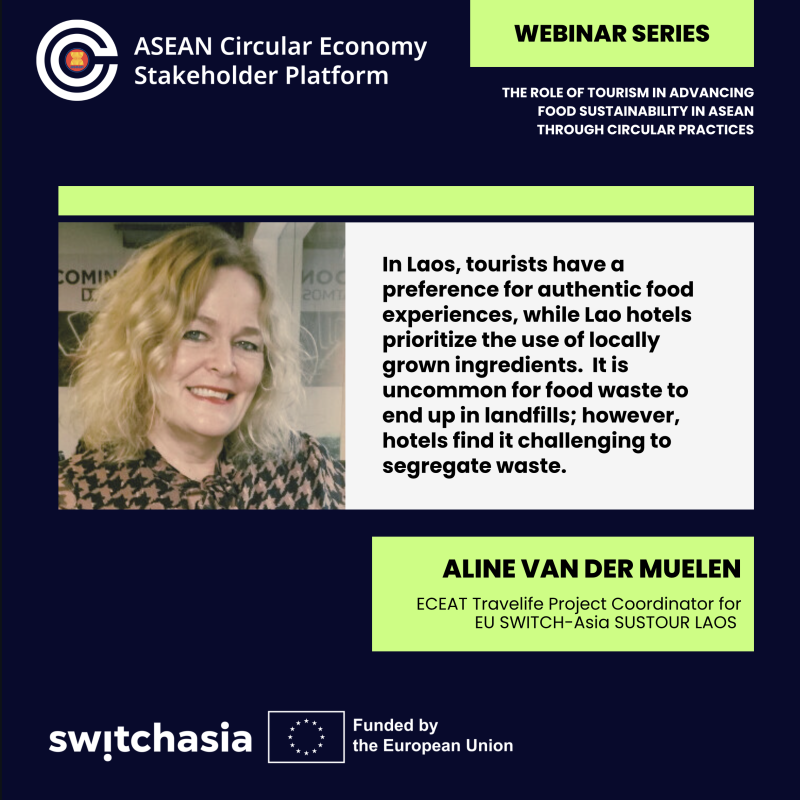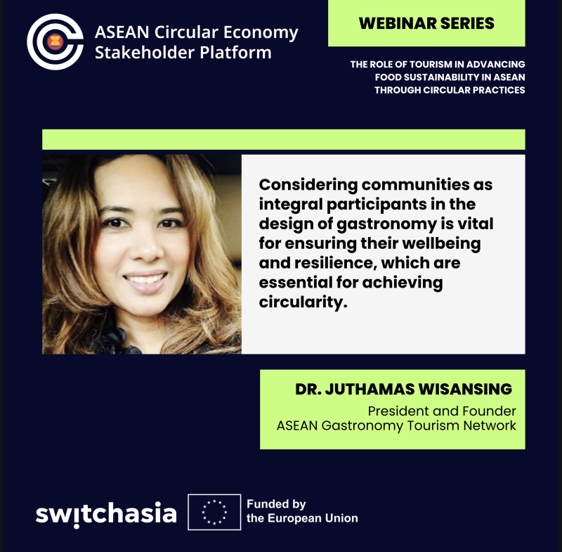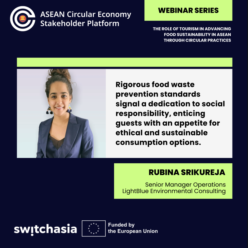 The 1.5-hour webinar "The Role of Tourism in Advancing Food Sustainability in ASEAN through Circular Practices," hosted by the ASEAN Circular Economy Stakeholder Platform (ACESP) and co-hosted by the EU SWITCH-Asia Policy Support Component, emphasised on the clear linkages between tourism and the food sector and highlighted on the apparent opportunities for interventions of sustainable food management in hospitality.