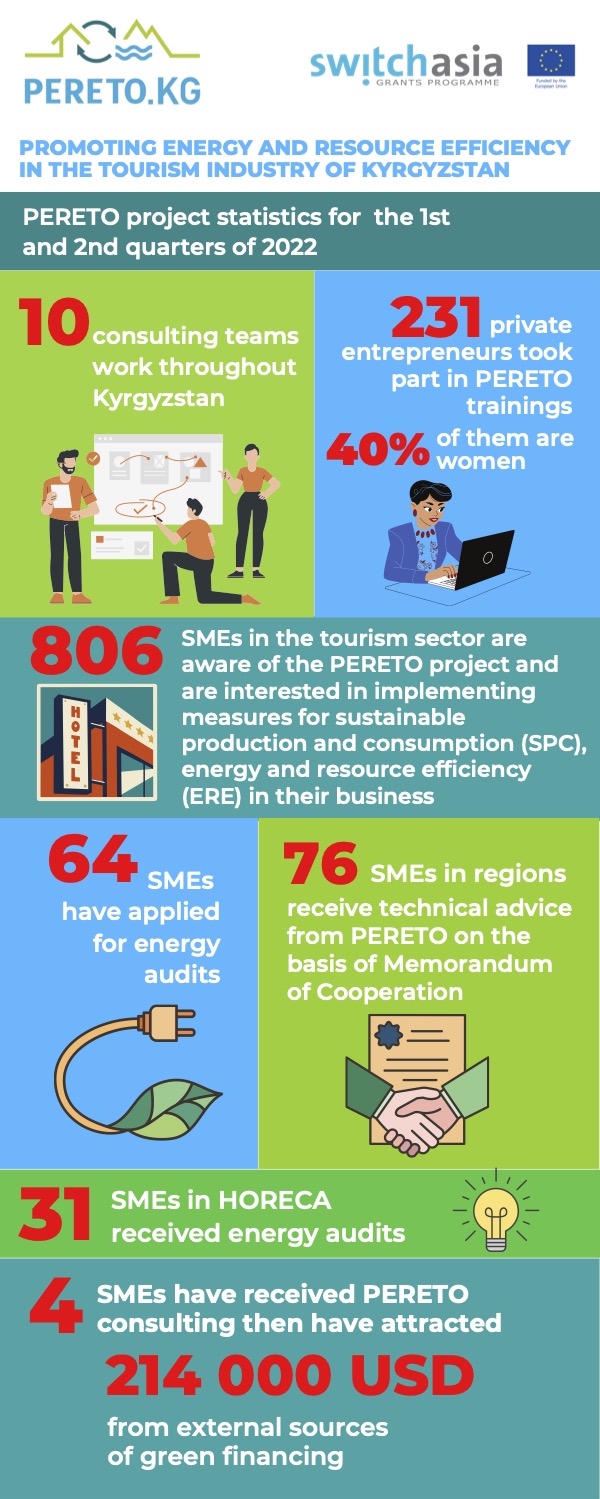 PERETO includes practices of sustainable development and consumption as well as implementation of renewable energy based equipment in HoReCa segment and tourism: resorts, sanatoriums, boarding houses, guest houses, among others. The project is funded by the European Union under the SWITCH-Asia programme and supported by the European Union Delegation to the Kyrgyz Republic in cooperation with the Ministry of Economy and the Department of Tourism.